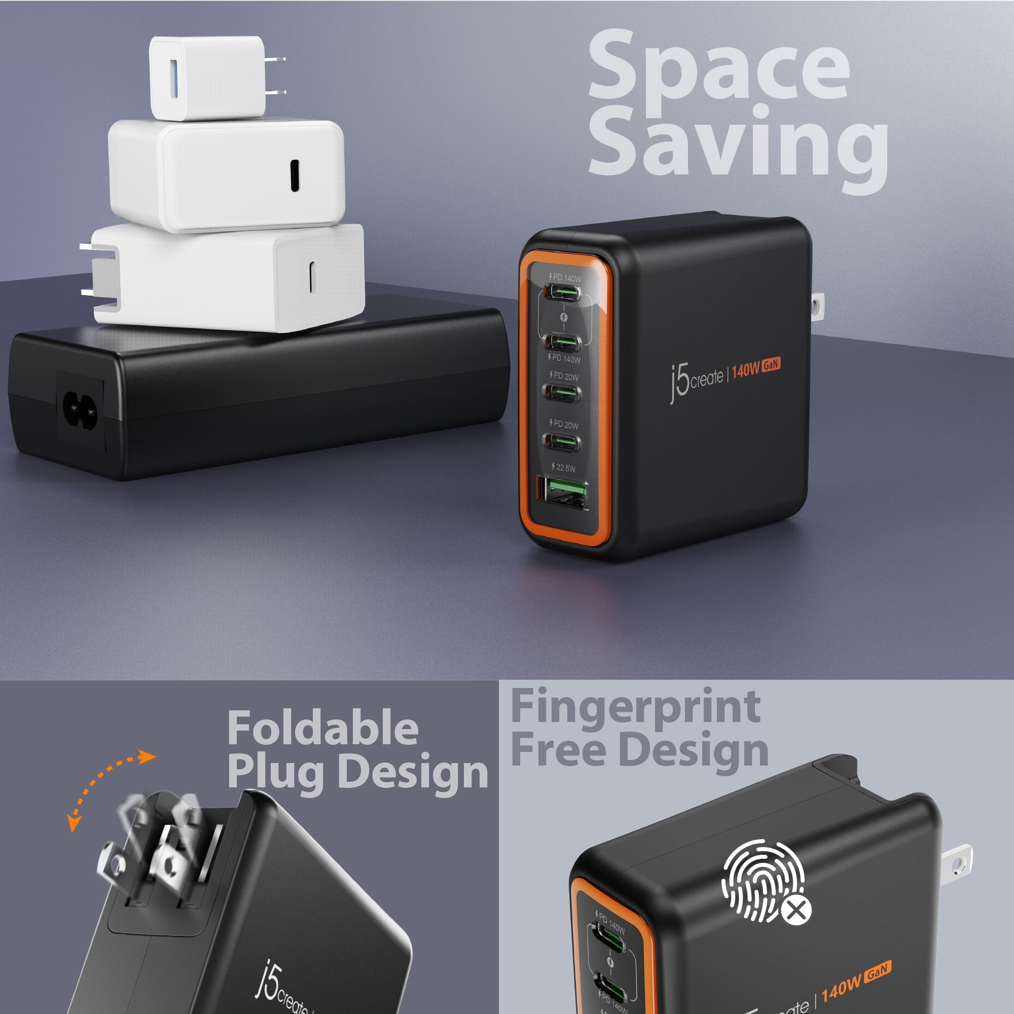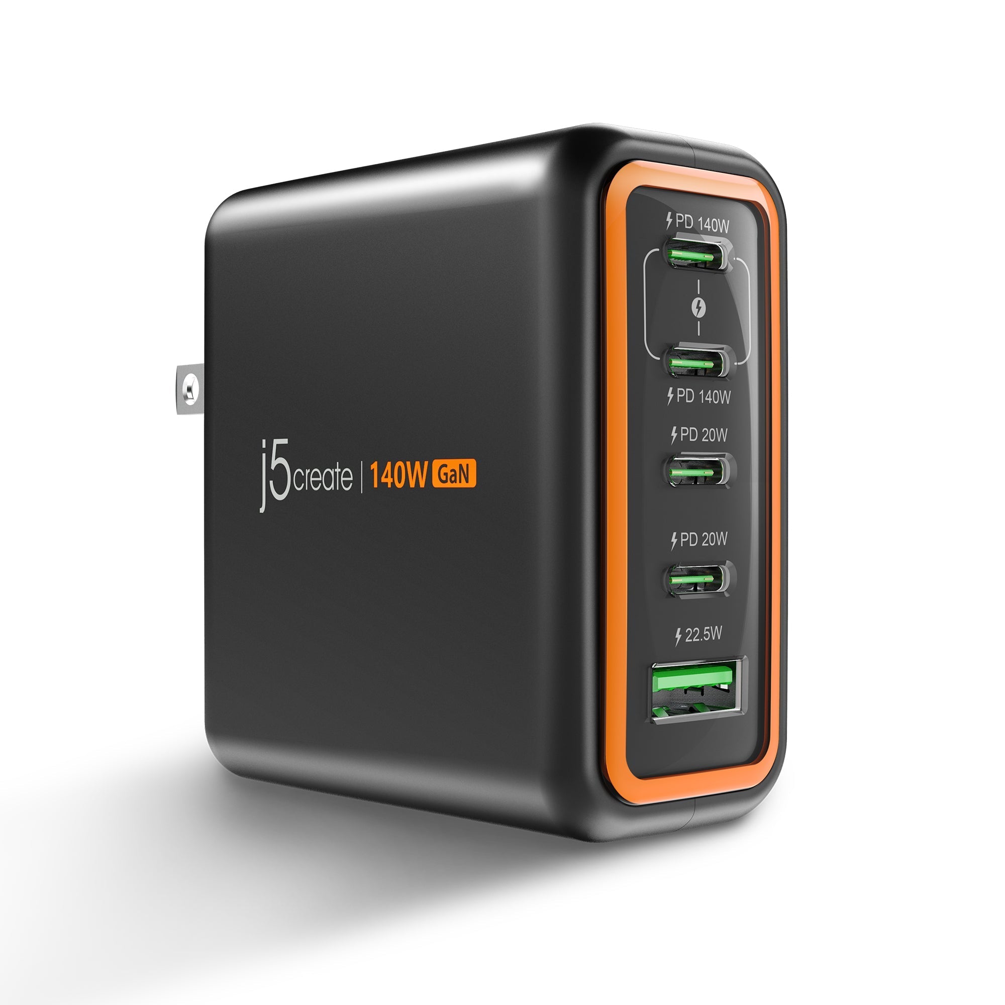 • 總輸出功率140W,四個USB-C充電埠,一個USB-A充電埠,可同時充電5個裝置。