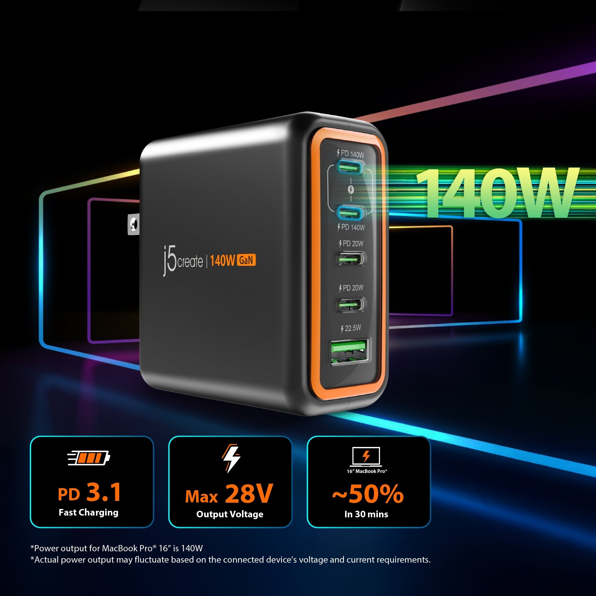 • 二埠USB-C支援PD3.1,單埠最高輸出140W,滿足高效能筆電的充電需求。